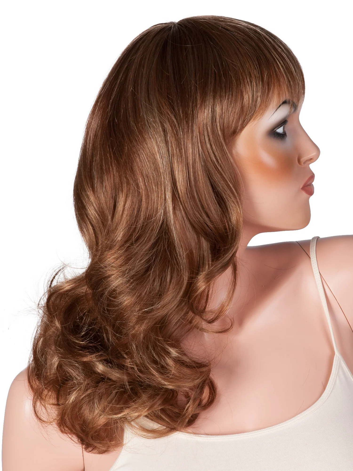 Two tone long brunette curly wig with fringe. This natural and subtle cut embodies warmth and brooding sexuality, perfect for a naughty-but-nice look. All our wigs are crafted from the finest synthetic fibres, which are woven to an adjustable one-size cap. These fibres are glossy and strong so they look and feel like great quality, real hair!