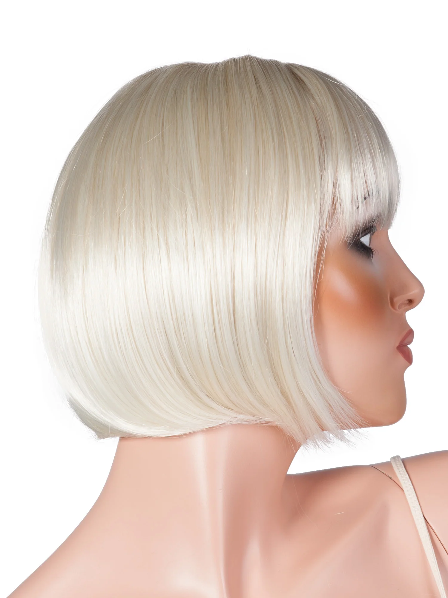 Short natural platinum blonde bob with fringe. A clean cut look which may not be as innocent as it appears. All our wigs are crafted from the finest synthetic fibres, which are woven to an adjustable one-size cap. These fibres are glossy and strong so they look and feel like great quality, real hair!