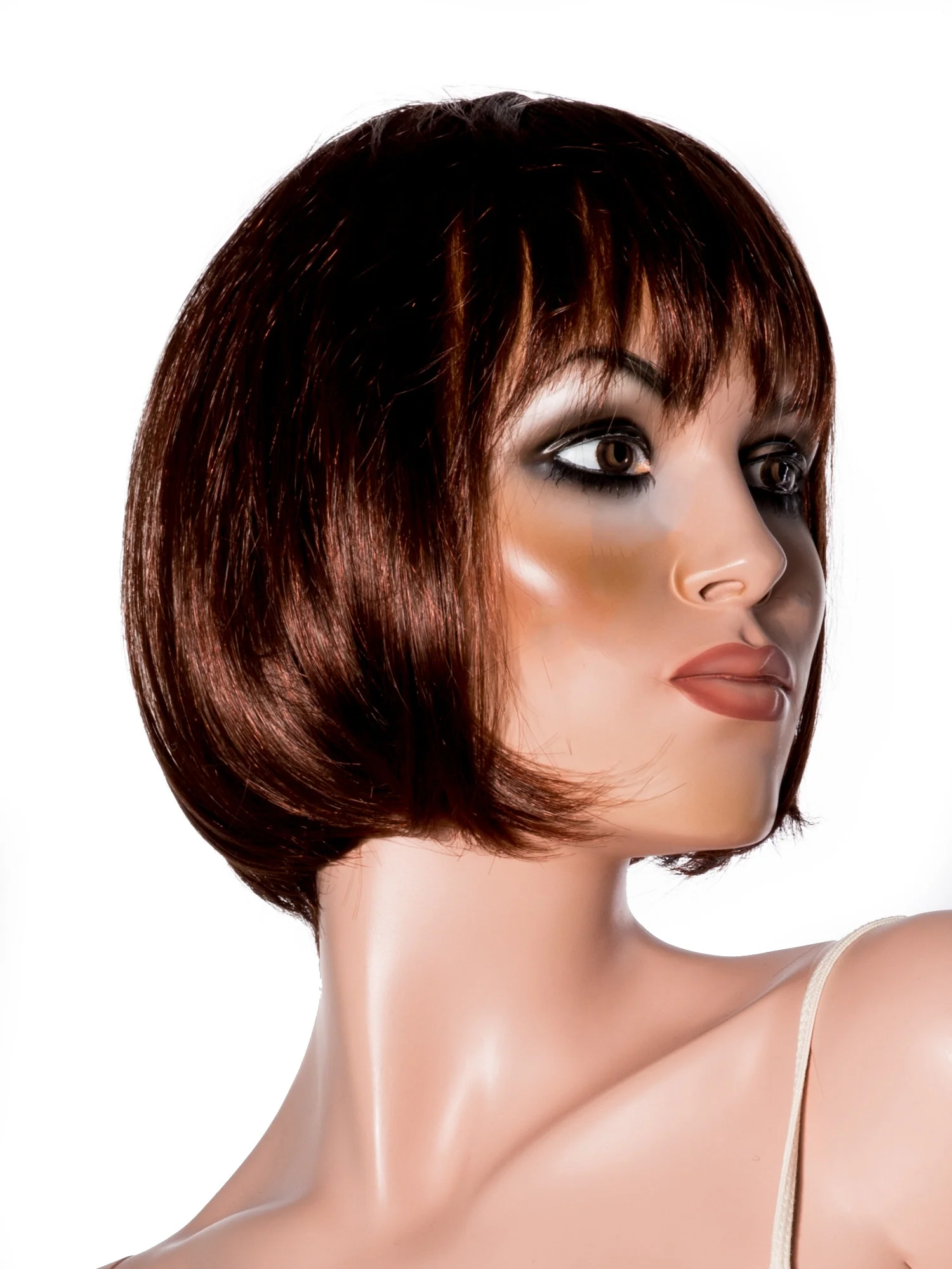 Short dark red bob with fringe. An alluring cut to create inviting looks which complement natural and earthy coloured materials. All our wigs are crafted from the finest synthetic fibres, which are woven to an adjustable one-size cap. These fibres are glossy and strong so they look and feel like great quality, real hair!